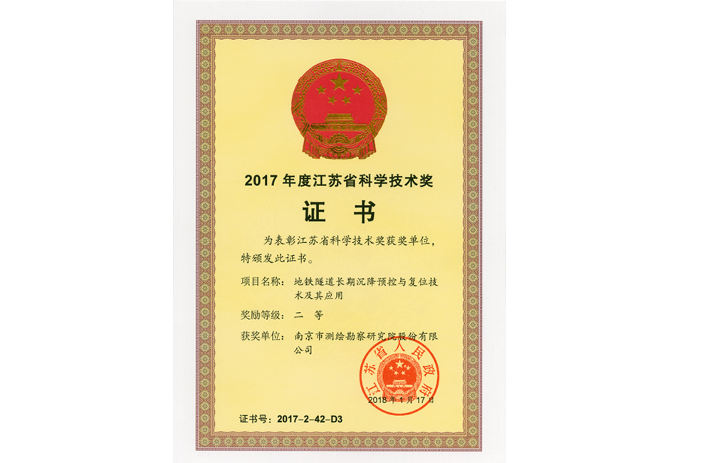 2017Äê¶È½ËÕÊ¡¿ÆÑ§ÊÖÒÕ¶þµÈ½±¡ª¡ªµØÌúËíµÀºã¾Ã³Á½µÔ¤¿ØÓ븴λÊÖÒÕ¼°ÆäÓ¦ÓÃ